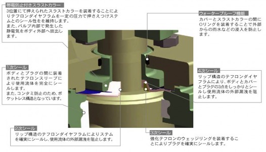 テフロンスリーブのプラグバルブは、360°のポートリップとハイプレッシャーリブ、ボトムリテンションにより確実に固定されたテフロンスリーブ構造により、ボディとプラグが完全密着してシート漏洩がありません。